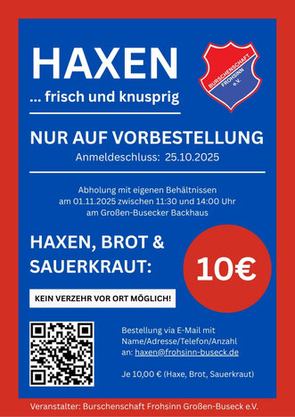 Knusprige Haxen, frisch aus dem Backhaus am Anger. Das gibt es auch wieder in diesem Jahr bei der 13. Auflage des Frohsinn-Haxenfests. Am Samstag, dem 01. November, backen wir für alle Freunde des Frohsinns und die Busecker Bevölkerung knusprige Haxen im Backhaus, serviert mit Kraut und Brot für nur 10,00 Euro. Die Haxen werden nur auf Vorbestellung zubereitet, dafür bitte bis spätestens 25. Oktober das Bestellformular weiter unten benutzen oder alternativ eine E-Mail an haxen@frohsinn-buseck.de schicken und dabei die gewünschte Anzahl sowie Name und Telefonnummer mitteilen. Abgeholt werden können die Portionen zwischen 11:30 Uhr und 14:00 Uhr, hierzu bitte einen eigenen Behälter mitbringen, ein Verzehr vor Ort ist nicht möglich.